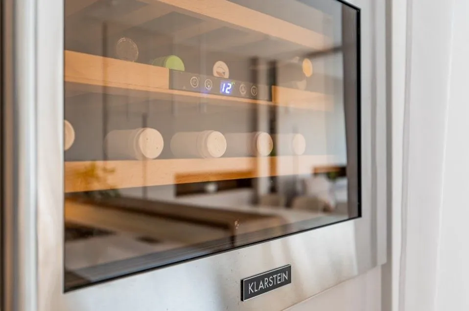 Za zmínku stojí designové osvětlení všech místností a nábytek na míru v provedení dub - lak v pudrovém odstínu, vyrobený dle návrhu interiérové designérky. V bytě je velké množství důmyslně řešených úložných prostor, s osvětlením uvnitř i vně. Kuchyňská linka je vybavena spotřebiči BOSCH nejvyšší třídy, indukční varná deska má integrované odsávání. Osvěžující komfort nabízí americká lednice s ledovačem nebo vestavěná vinotéka. Pracovní deska kuchyňské linky je z umělého kamene Corian.