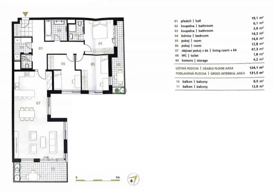 Dispozici bytu (131,5 m2) tvoří předsíň, 3 ložnice, obývací pokoj s jídelním a kuchyňským koutem, koupelna s vanou, en-suite koupelna se sprchovým koutem a wc příslušející k ložnici, další samostatné wc a technická místnost. Byt má 2 terasy - se vstupem z obývacího pokoje (12,8 m2) a vstupem z ložnice (8,9 m2). Cena zahrnuje také prostorný sklep a 2 parkovací stání v suterénu domu.