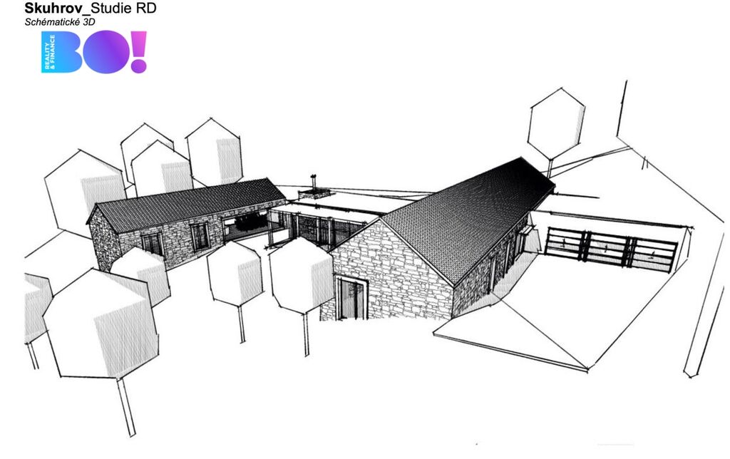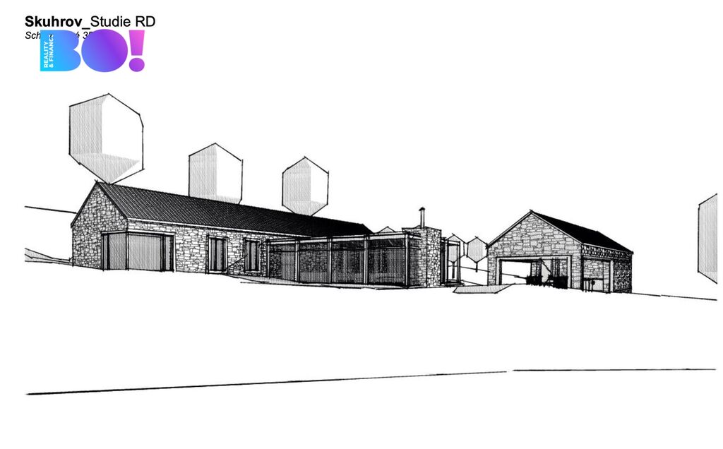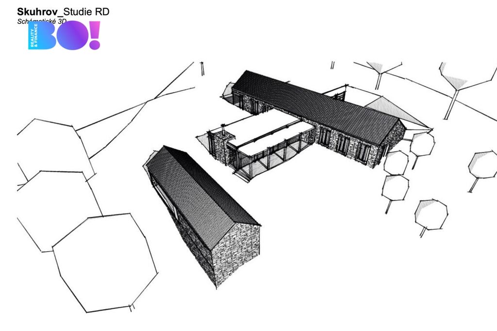 Je to učiněná oáza klidu a bezpečí. Poté, co vstoupíte na pozemek z příjezdové cesty, rozprostře se před vámi prostor ohraničený z bočních stran stromy a zelení. Pěšinou kolem staveb umístěných po obou stranách projdete až na konec pozemku, kde se na hladině rybníku zrcadlí nebe s mráčky i větve okolních stromů. Rybník už k prodávaným nemovitostem nepatří, ale výhled na něj i přístup si můžete užívat bezprostředně z vaší zahrady, či vhodně umístěného domu. Jednu studii možného bydlení přikládáme.