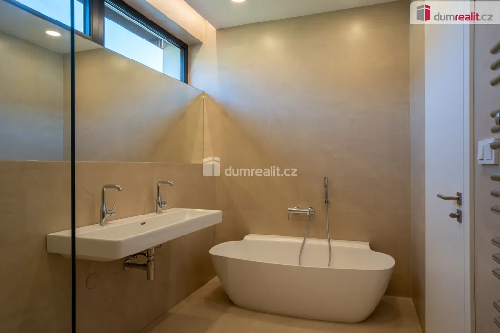 - od podlahového vytápění, přes HasGrohe baterie, volně stojící vanu z litého mramoru, 2,3m zvýšených bílých lakovaných dveří Sapeli, až po dřevěnou podlahu