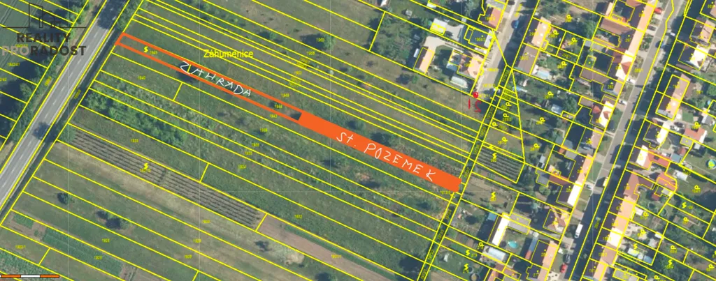Pozemek má plochu 1227 m2, šíře pozemku je 6 m. Zastavitelná část pozemku je zakreslená na foto katastrální mapy.