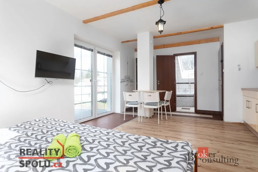 • Bytová jednotka 1+1 + ubytování v soukromí 1 apartmán a 3 pokoje s kapacitou 10 lůžek a 1 přistýlka. S komfortním vybavením vířivka, sauna, společenská místnost, velká kuchyně a americká lednice, několik koupelen.