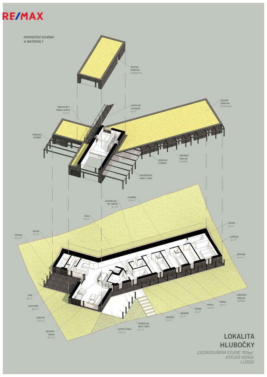 Jednopodlažní dům s obytným podkrovím o celkové užitné ploše 178,6 m² a dispozicí 5+1 je situovaný z části na rovinatém a z části na svažitém terénu. Dům se prodává ve standardu hrubé stavby. Ta zahrnuje základovou desku, hydroizolaci a tepelnou izolaci, stavbu z keramických pálených cihel o minimální tloušťce zdiva 440 mm včetně překladů a věnce, klempířské prvky, hliníkové okenní rámy s trojsklem, dále oplocení, pergolu, finální fasádu, bílou omítkovinu a kompletní dřevěné prvky.