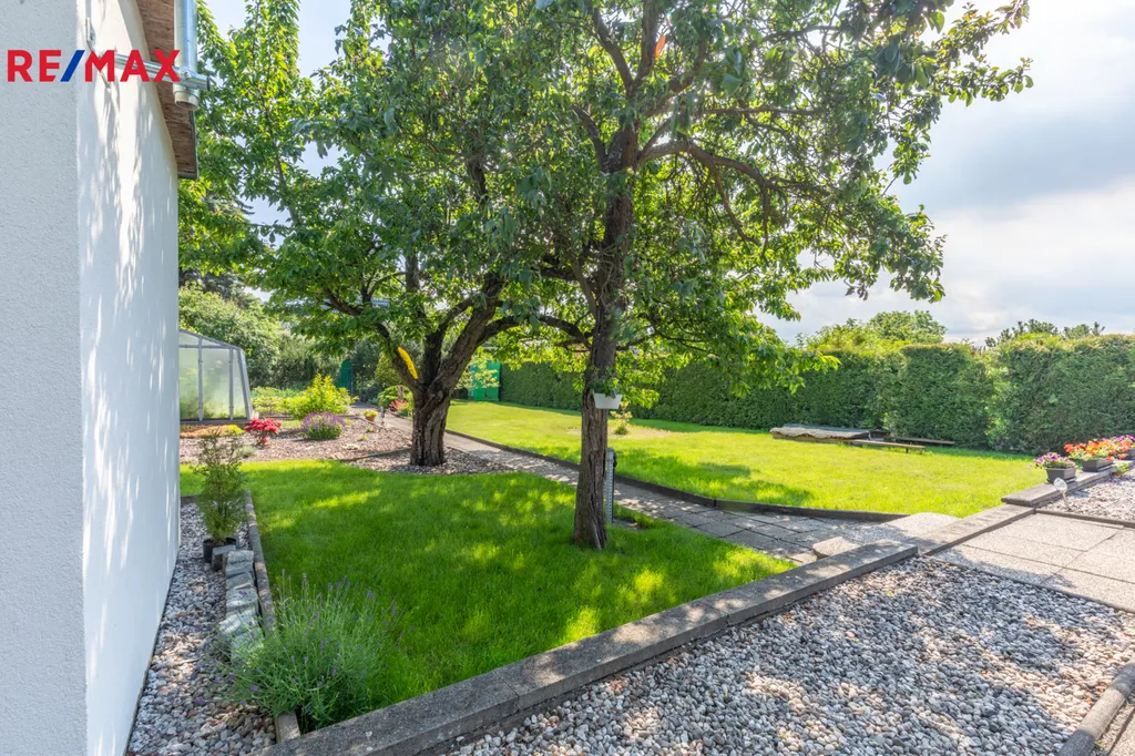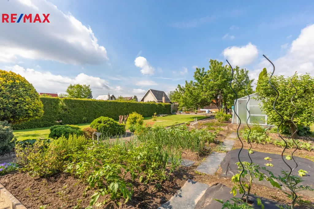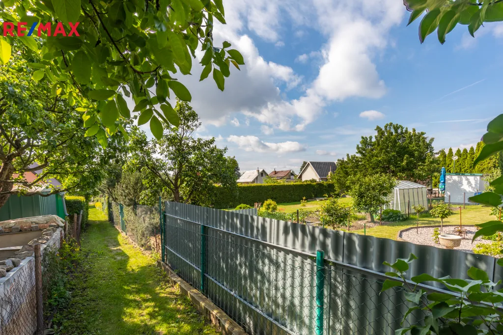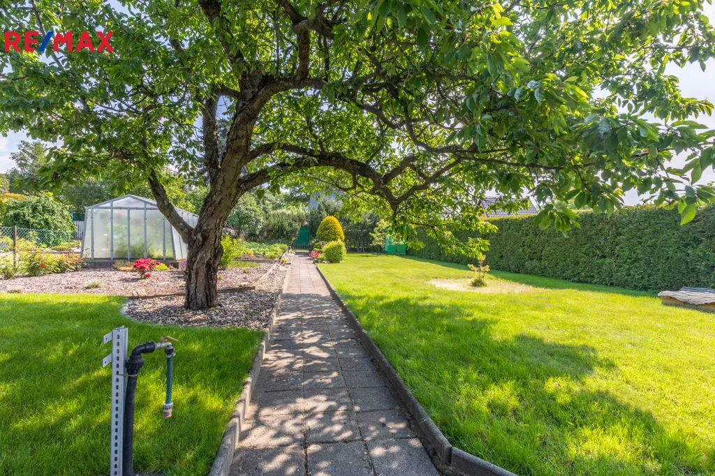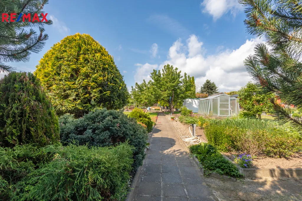 Zahrada je ideální nejen pro rekreaci a každodenní relaxaci celé rodiny, ale také pro nadšené pěstitele. Skleník o rozměrech 3 x 2,5 m ocení každý zahrádkář. Na zahradě rostou okrasné keře a plodící ovocné stromy jako třešeň, jabloň, broskvoň a slíva. Jsou zde také založené záhonky pro pěstování zeleniny, rajčat a dalších plodin. Zatravněná plocha je pravidelně udržována a opečovávána, což vytváří krásný zahradní koberec. V rohu zahrady se nachází zahradní plastová buňka s chemickým WC.