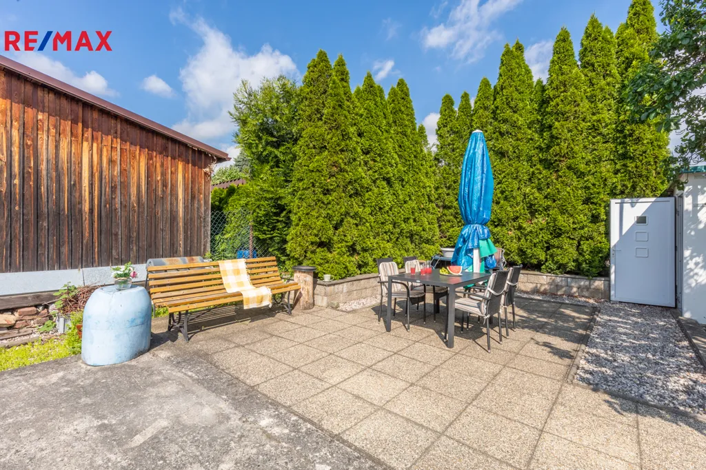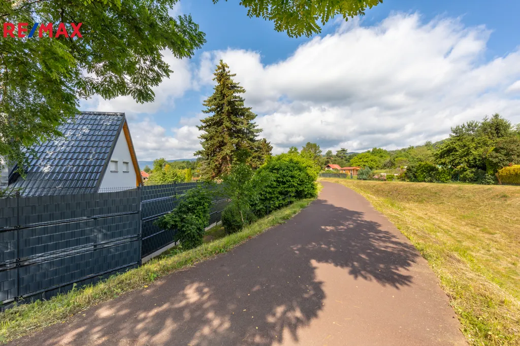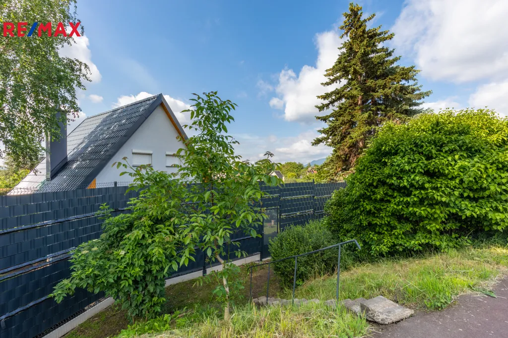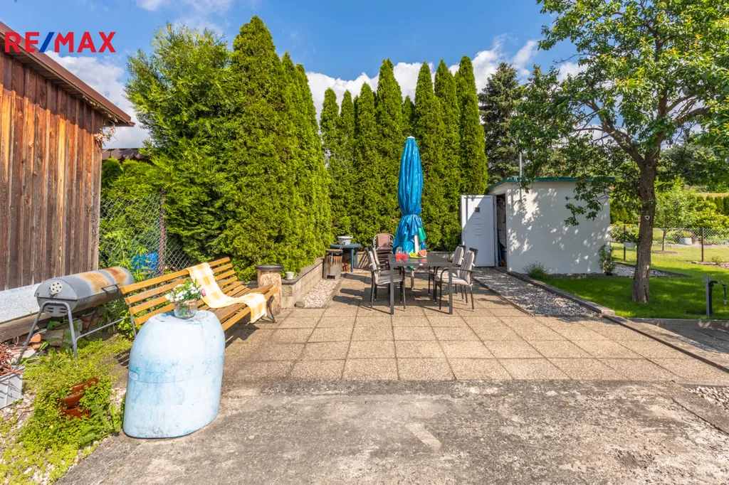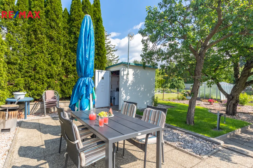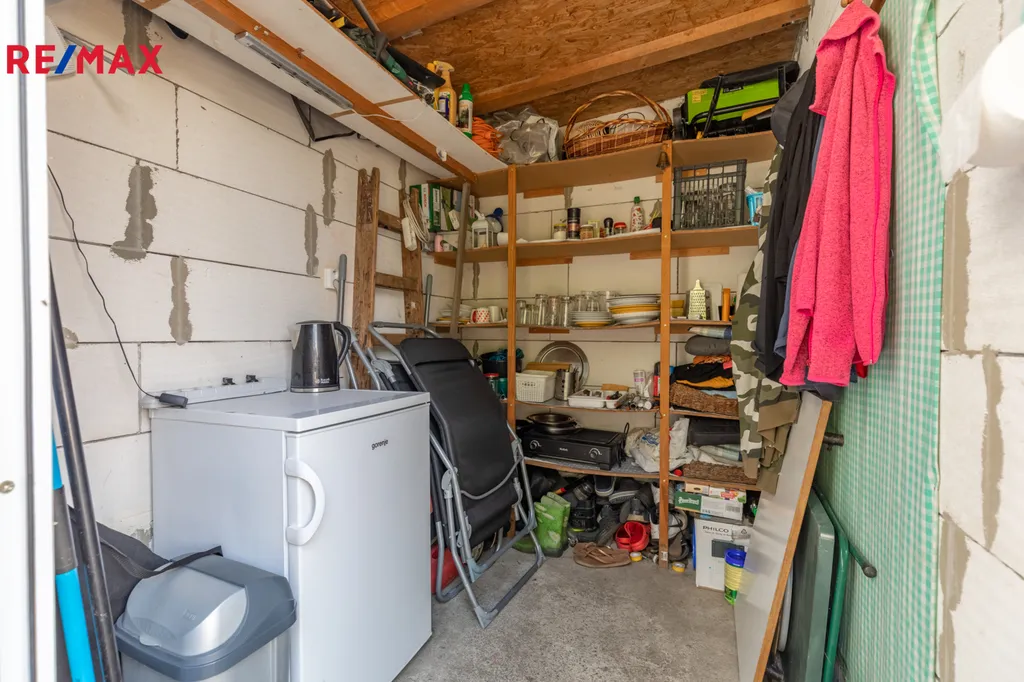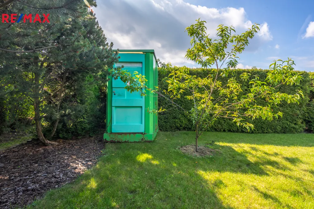 V krajní části zahrady je postaven zděný zahradní domek na úschovu zahradního nábytku či nářadí o velikosti 2 x 2,5 m (z Itongu) pod stálým uzamčením kvalitních plastových dveří. Velkým bonusem této nabídky je již existující základová deska s rozměry 6 x 4 m, která jen čeká na výstavbu zahradní chatky budoucím majitelem. Zde je připraven i vývod vody, elektřiny a odpadu do 200 litrové nádrže. Bez přímé příjezdové komunikace.