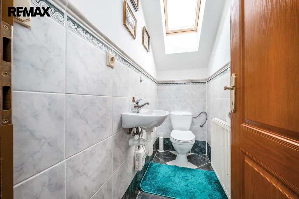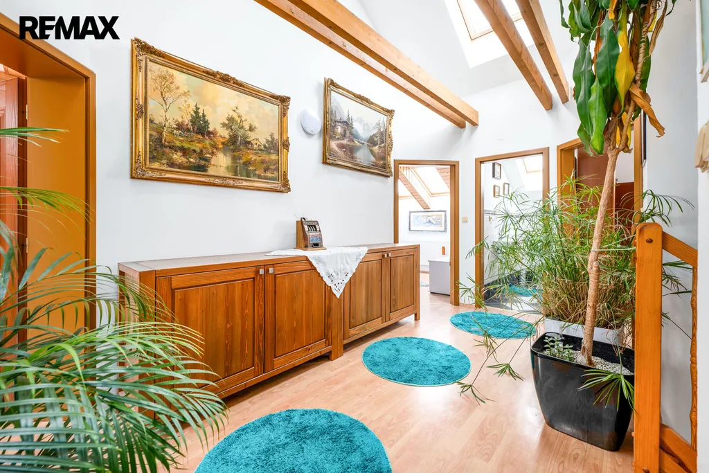1.patro - na konci schodiště je hala, odtud vstup do hlavní koupelny s vanou a sprchovým koutem, jedna ložnice se vstupem na balkon a druhá ložnice je také se vstupem na balkon, třetí ložnice je upravená na posilovnu se saunou, vedle je samostatné WC. Celkem je v domě 9 místností, dvě koupelny, zimní zahrada.