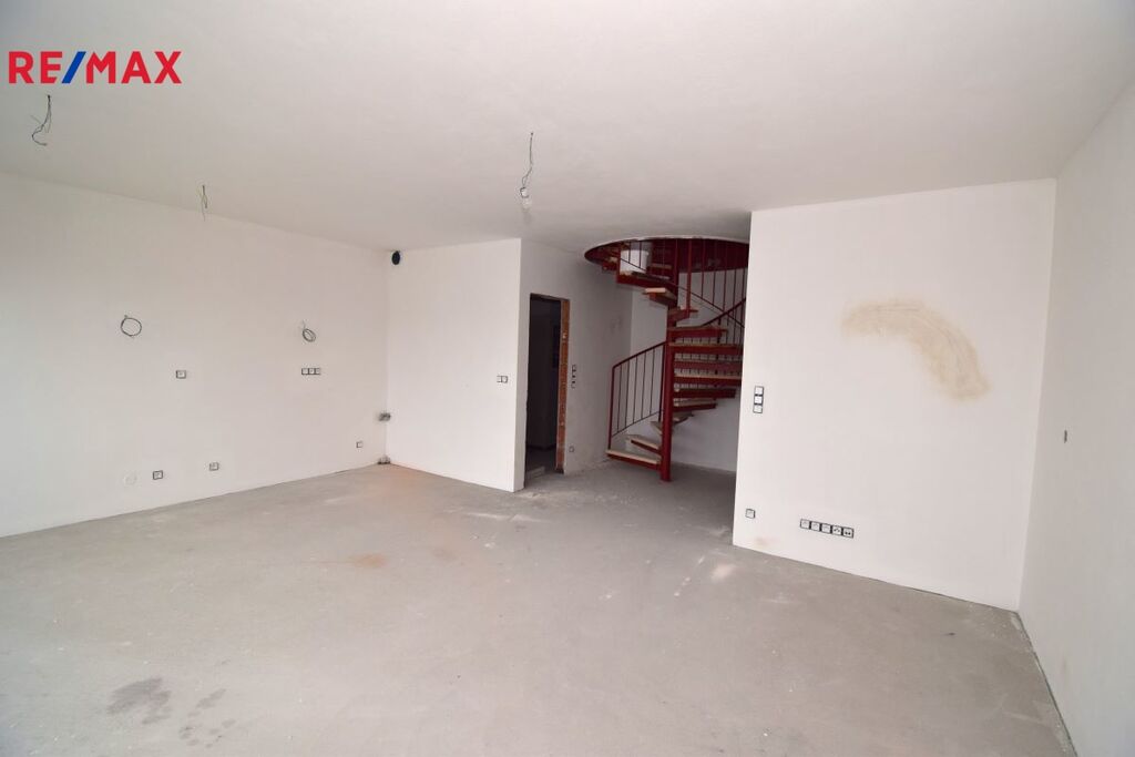 Za vchodovými dveřmi je předsíň se schodištěm, samostatné WC s umyvadlem a hlavní obývací prostor s přípravou na kuchyňskou linku. Z obývacího pokoje je vstup na terasu. Terasa má téměř 10m2.