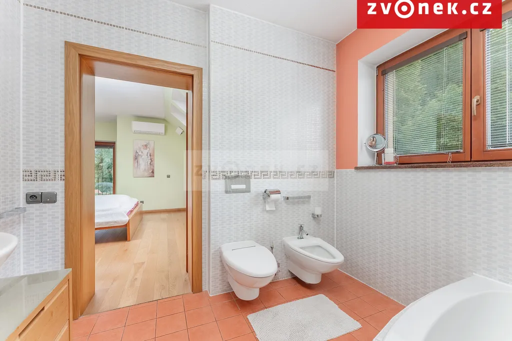 V nemovitosti se nachází osobní výtah, vedený od suterénu s wellness, přes obývací pokoj s kuchyní až do prostoru ložnic.
