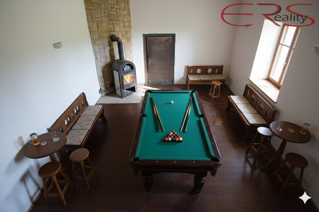 Prodáváme funkční ubytovací část se čtyřmi samostatnými apartmány (každý s koupelnou), společnou či vlastní kuchyňkou, dvěma společenskými místnostmi s krbem, saunou a lyžárnou. Venku vířivka, trampolína a kryté posezení s grilem. Vytápění tepelným čerpadlem, napojení na vodovod, odkanalizování ČOV, 230/400 V. Parkování pro 8–10 aut na vlastním pozemku.