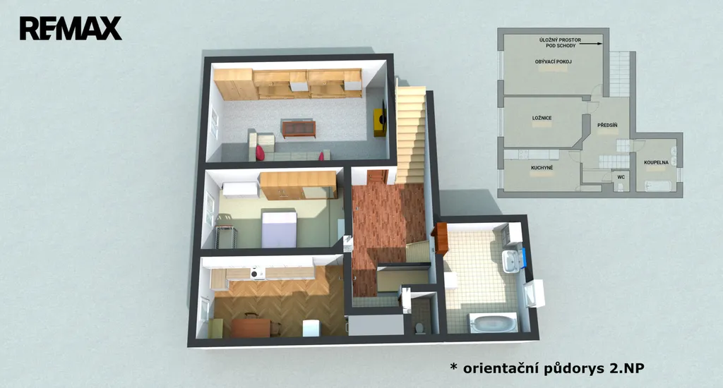2. NP vstupní hala 8,80 m2, kuchyň 12,10 m2, pokoj 17,15 m2,