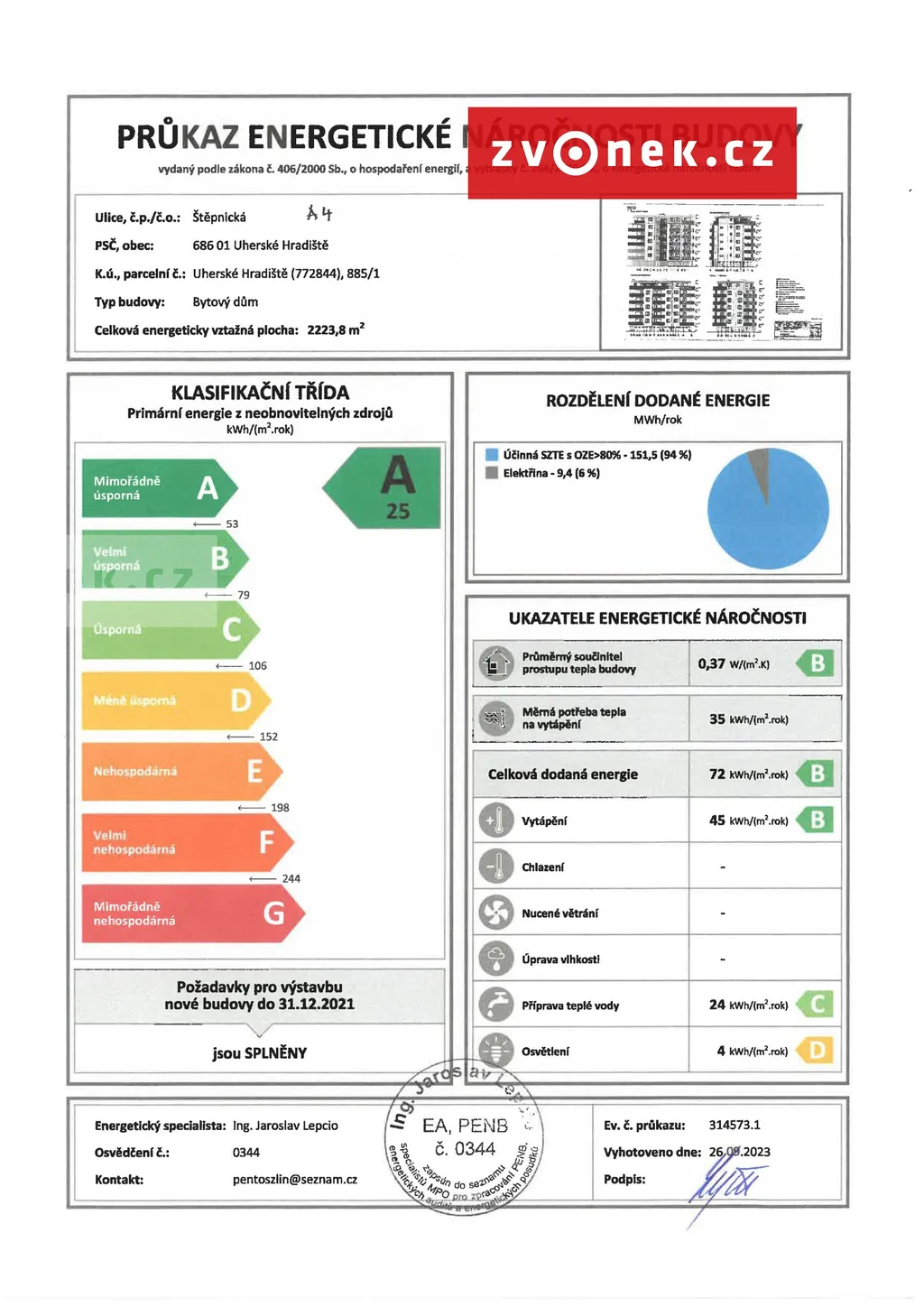| Ukazatel energetické náročnosti | 25 kWh/m2 za rok |