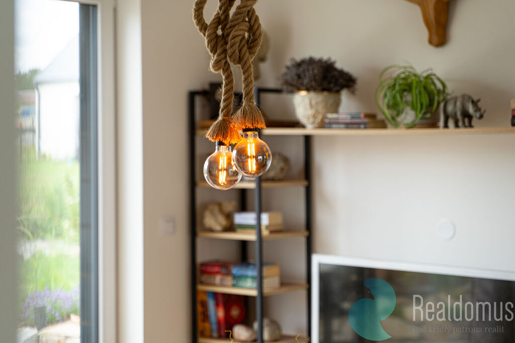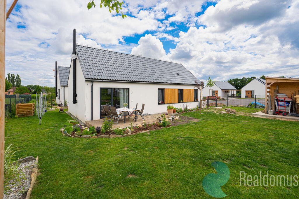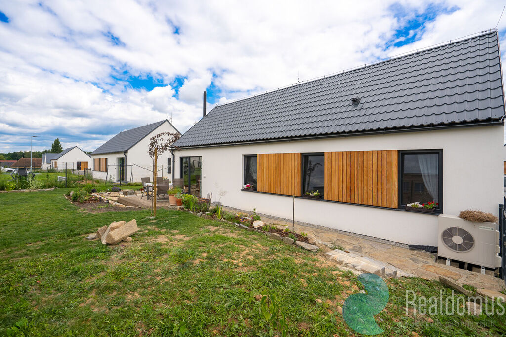 Dům, který byl kolaudován v roce 2022, je zcela dokončen včetně terasy, zahrady a zahradního domku, nachází se v klidné části vesnice a je součástí zajímavého projektu dřevostaveb, které se pyšní nejen nízkoenergetickou náročností, ale především architektonicky velmi zdařilým provedením a praktickým dispozičním řešením. Dům je součástí dvojdomku, domy jsou ovšem spojeny pouze krytým stáním (pro 2 auta pro každý dům) a je umístěn na pozemku o rozloze 491 m2. Užitná plocha domu je 80 m2 a skládá se ze zádveří, technické místnosti, samostatného wc, koupelny, 2 pokojů, ložnice, kuchyňského koutu se spíží a prosluněného obývacího pokoje, který je spojen s jídelnou a má vstup na terasu. Dům je vybaven moderní kuchyní, je velmi vzdušný a plný světla. Krásnou atmosféru pomáhají vytvářet i kvalitní krbová kamna značky Romotop, umístěná mezi jídelnou a obývacím pokojem. Kamna jsou jednou z možností vytápění, dům má ovšem i tepelné čerpadlo. Nízkoenergetický standard doplňují izolační trojskla v oknech a zateplení.