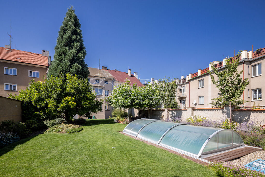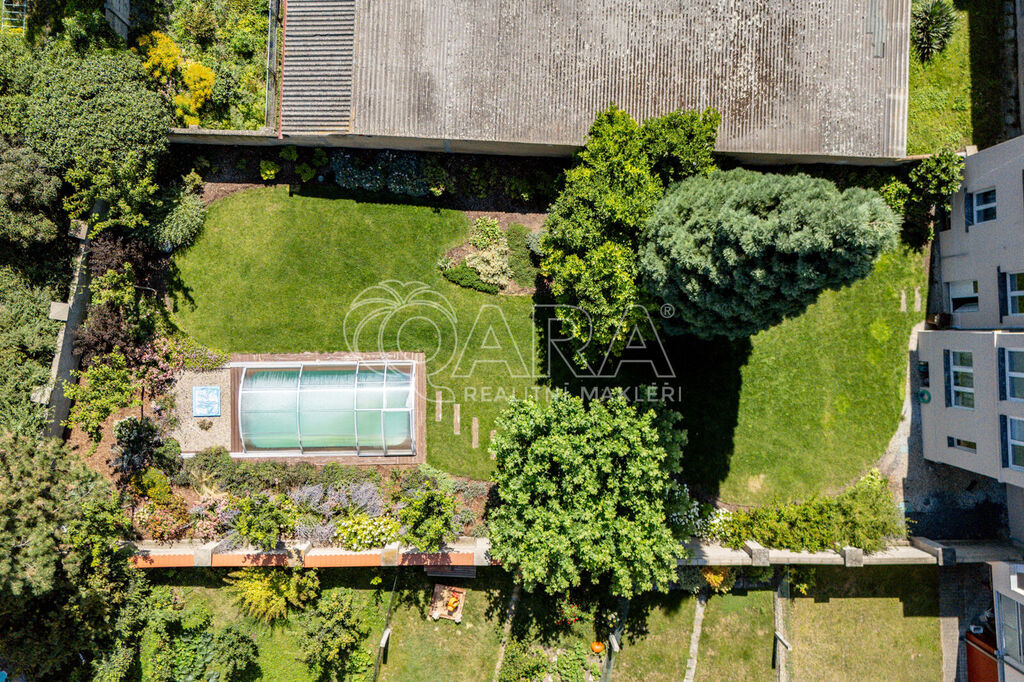 Kromě travnatých ploch a okrasných dřevin zde naleznete také grilovací pergolu a krytý bazén (s přípravou na tepelné čerpadlo).