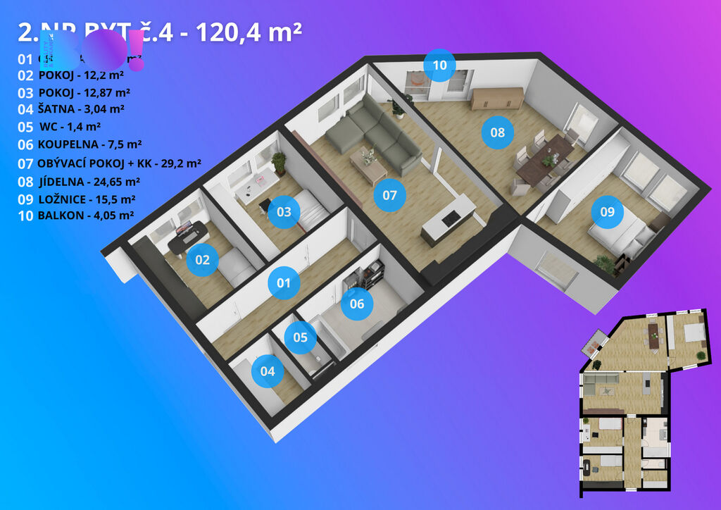 Exkluzivní nabídka opravdu prostorného bytu v centru Prostějova 4+kk, podlahová plocha 123,9 m² s balkónem (1,5 m²) a sklepní kójí (2,5 m²).