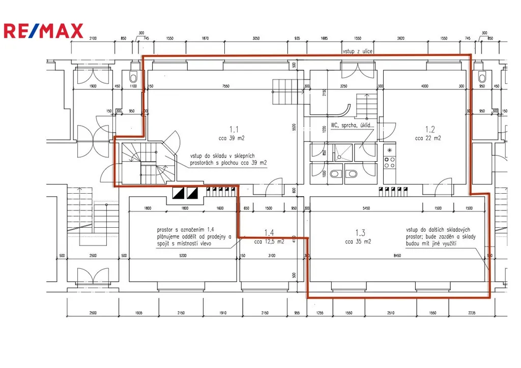 Obchodní prostory se skládají ze samostatné místnosti s hlavní výlohou prodejny (provozovny) s přímým vstupem z ulice.