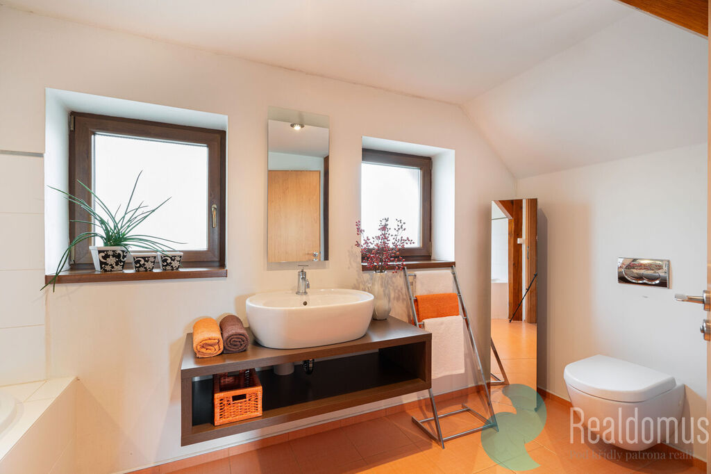 Technické parametry domu i kvalita provedení stavby zaručují bezstarostný život na nádherném místě s výhledem na České Budějovice a okolí. Dům je napojen na městskou kanalizaci a vodovod, na zahradě je i studna, z níž lze čerpat užitkovou vodu. Vytápění domu je zajištěno elektrokotlem, v přízemí je podlahové topení, v patře pak radiátory. V hlavní obytné místnosti jsou krbová kamna, která lze použít k vytápění hlavní bytové jednotky a dotváří též nádhernou atmosféru tohoto stylového prostoru.