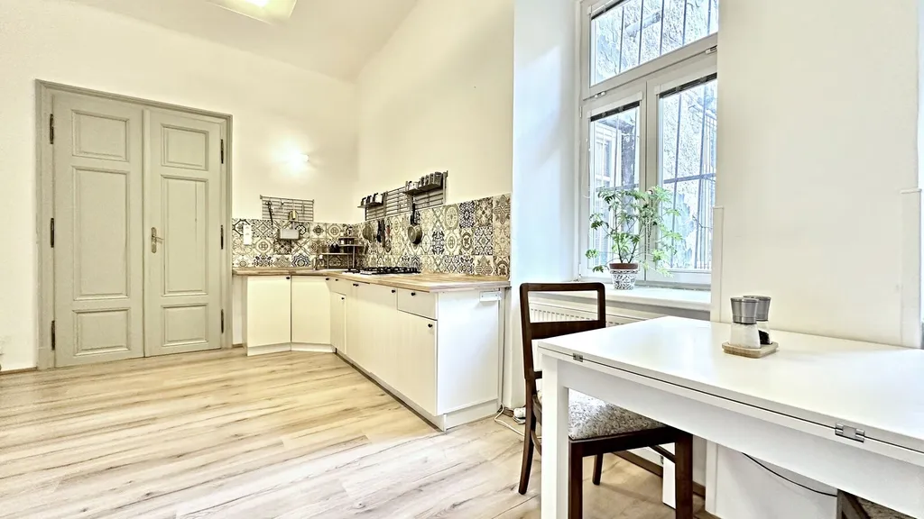 Byt se nachází ve zvýšeném přízemí cihlového historického bytového domu. Čistá podlahová plocha bytu je 103 m2 a celkovou užitnou plochu 114m2, součástí prodeje je i zděný sklep s výměrou 13m2.
