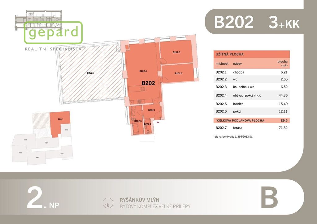 Realitní společnost Gepard nabízí k prodeji byt v OV 3+kk, 89,6m2 s terasou 71,3m2 byt č. B202) v developerském projektu Ryšánkův mlýn ve Velkých Přílepech vzdálených od Prahy pouhých 6km a 15min autem.