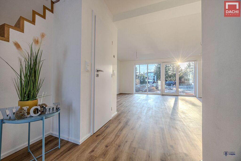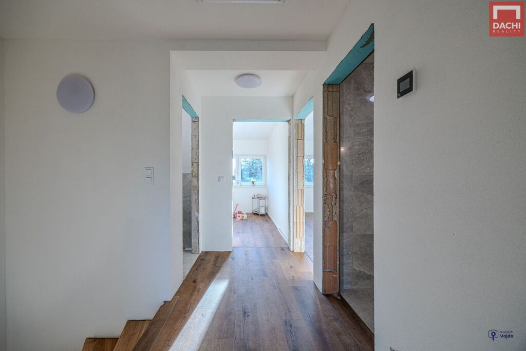 V přízemí domu najdeme velkorysou, prosvětlenou obývací zónu s kuch.koutem a jídelním koutem v budoucnu se vstupem na terasu nebo na zahradu. Dále je také v přízemí špajz, koupelna se sprchovým koutem a WC, technická místnost a praktická šatna. V 1. patře pak najdeme 2 samostatné neprůchozí pokoje, ložnici s pracovním koutem, relaxační koupelnu s vanou, samostatné WC. Možnosti rozšíření a zpřístupnění podkroví pro hernu, fitness nebo relaxační zónu. Podlahy budou pokryty vinylovou krytinou, která je nejen praktická, ale i estetická. Součástí kupní ceny je také kuchyňská linka včetně vestavěných spotřebičů, sanitární vybavení a obložkové dveře. V ceně je zahrnuto oplocení a zámková dlažba před domem. Nad rámec kupní ceny je možné dořešit pergolu, oplocení terasy, kryté parkovací stání pro auto, zabezpečovací systém, fotovoltaické panely s možností dotace nebo realizaci interiérů dle přání a nápadů budoucích majitelů. Dům je dokončený, zkolaudovaný a připravený k bydlení.