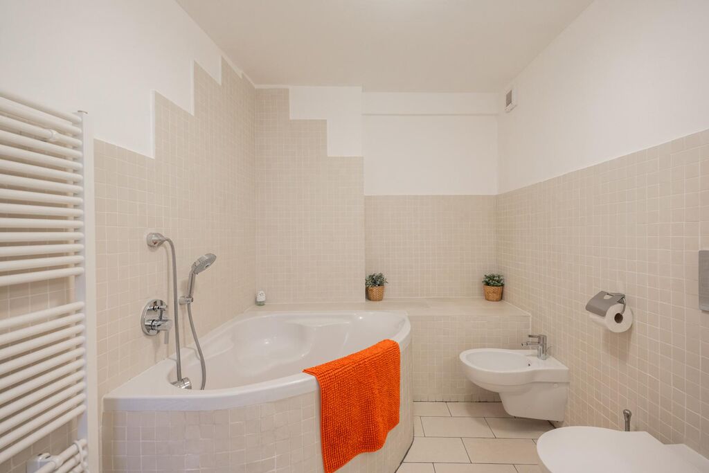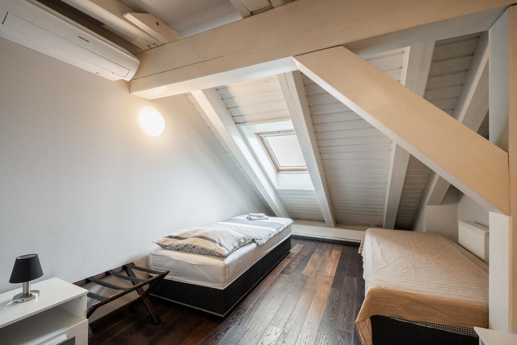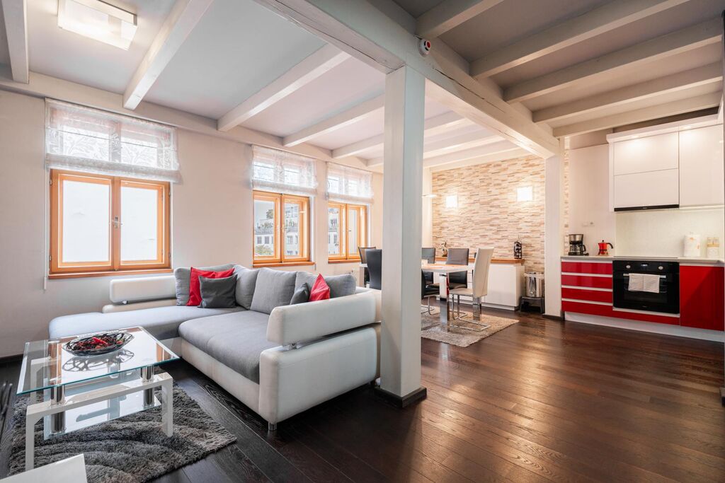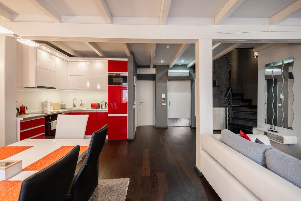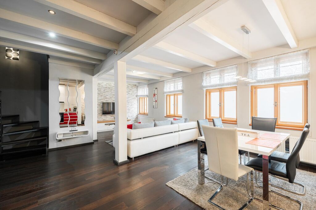 Dominantou bytu je otevřený obývací pokoj s jídelním koutem a s kuchyní s vestavnými spotřebiči.  Z obývacího pokoje je vstup do ložnic po schodech v patře. Ložnice jsou oddělené a poskytují tedy soukromí. Byt poskytuje prakticky dvě koupelny. Světlá prostorná  koupelna se sprchovým koutem je umístěna v dolní části bytu, s umyvadlem a wc. Druhou toaletu nalezneme i ve druhé koupelně, kde se nachází vana i bidet.