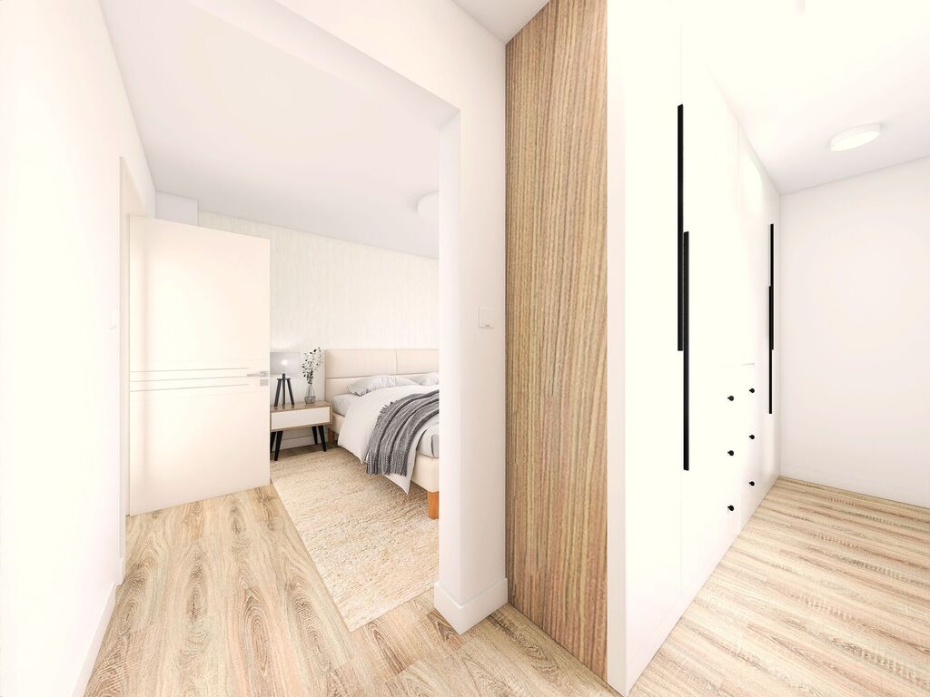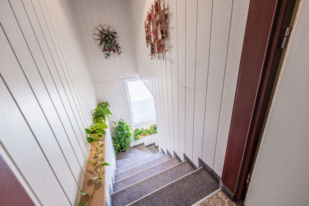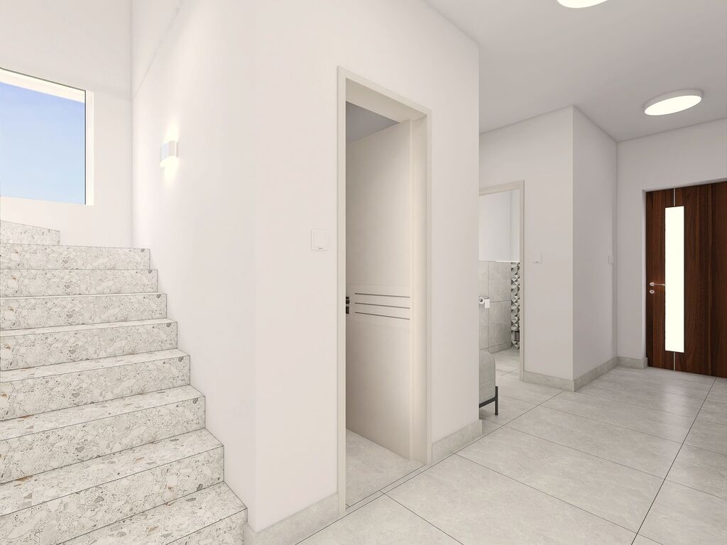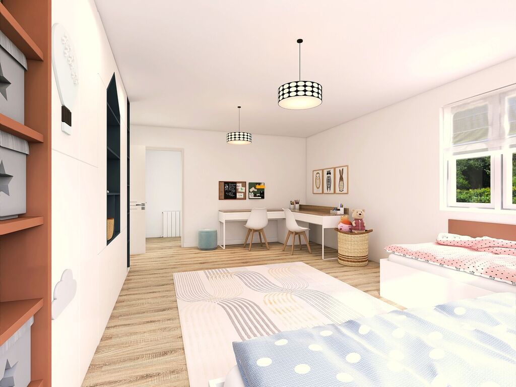 V horním patře je druhá jednotka: obývací pokoj s kuchyňským koutem, ložnice se šatnou, menší pokoj a koupelna s WC. Dispozice se domu se dá ale předělat k potřebám každého a je možné z něj tak vybudovat nový domov pro jednu rodinu.