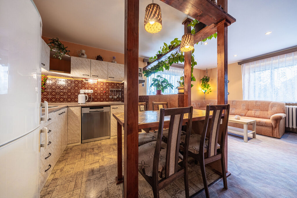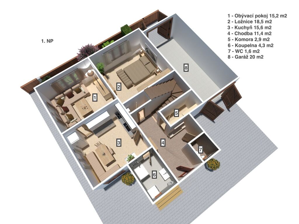 v přízemí se nachází samostatná bytová jednotka 2+1 – kuchyň, obývací pokoj, ložnice, koupelna se sprchovým koutem a WC, předsíň, chodba, komora a další samostatné WC.