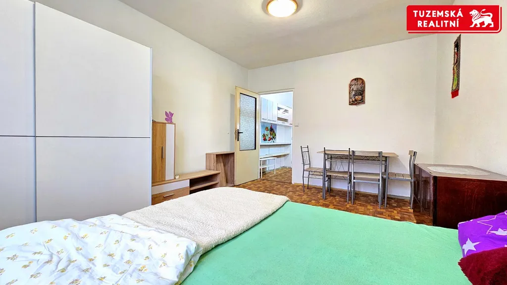 Vytápění bytu a teplá voda jsou centrální z vlastní kotelny, kterou si bytový dům nově vybudoval. V koupelně je podlahové vytápění, v pokoji je radiátor s termohlavicí a měřákem tepla. Okno je orientované severním směrem a má izolační dvojsklo.