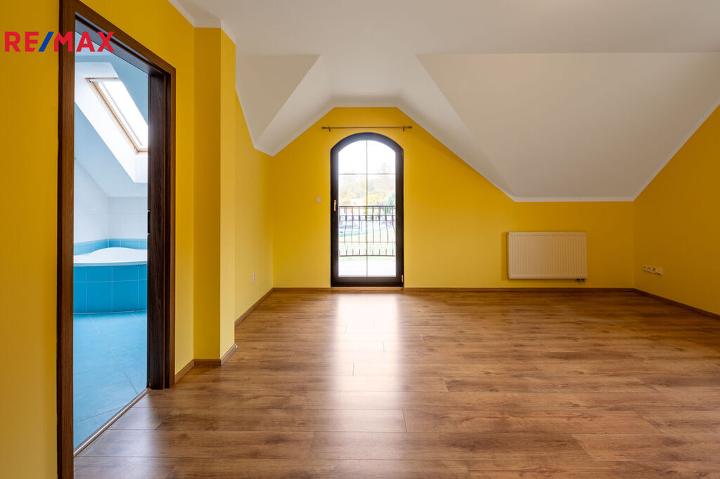 V prvním patře jsou tři další pokoje. Hlavní ložnice disponuje vlastní koupelnou a balkónem, který nabízí nádherný výhled na okolní krajinu. Pro pohodlí celé rodiny je zde navíc druhá koupelna.