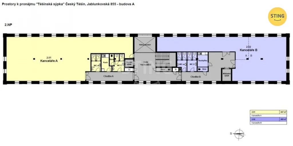 2. NP ( 1 patro) o výměře 451 m2, ideální jako kancelářské či skladové prostory, lékařské ordinace (2 prostory o výměře 204 + 207 m2) s možností rozdělení na poloviční plochu.