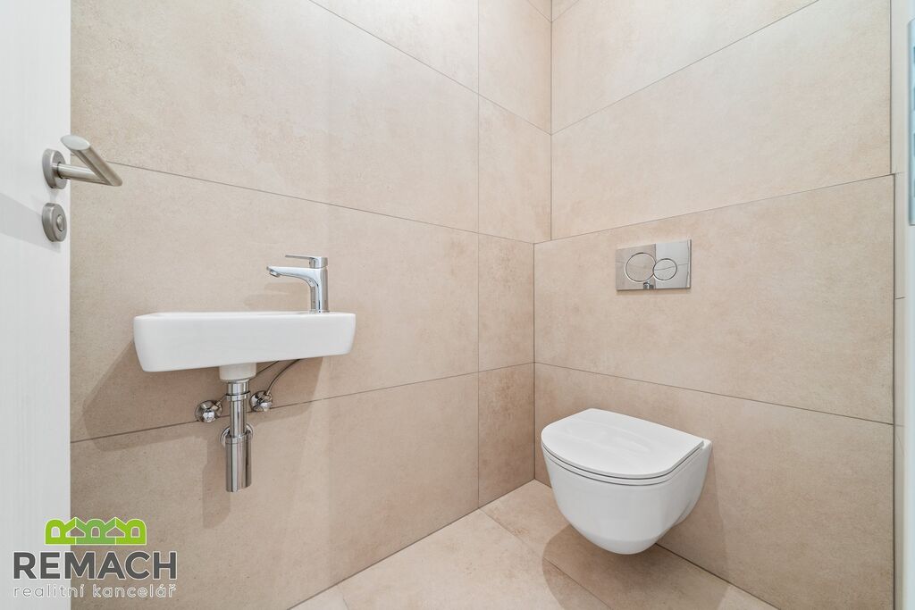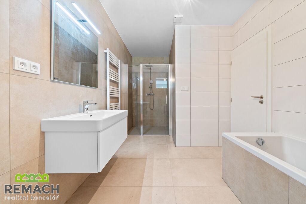 Koupelna je vybavena vanou i sprchovým koutem, toaleta s umyvadlem je samostatná a návštěvy vám tak nebudou vcházet do vaší osobní koupelny.