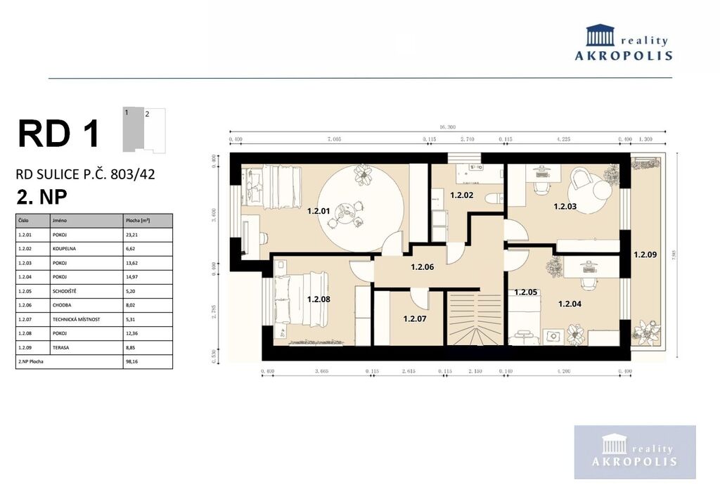 V patře se nachází čtyři prostorné ložnice, dvě z nich s přímým vstupem na balkon, šatnu a velkou koupelnu s WC a vanou.