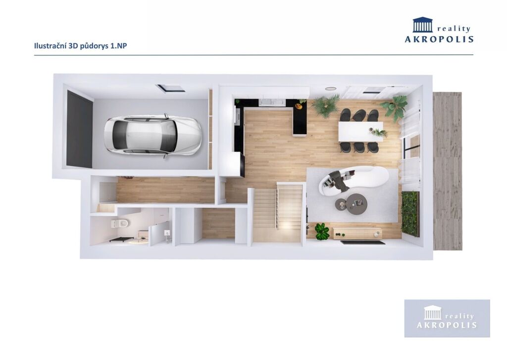 Přízemí je bezbariérové a zahrnuje prostorný obývací pokoj s kuchyní a jídelnou, velkoplošné posuvné prosklení s přímým vstupem na terasu a zahradu, koupelnu s WC, technickou místnost a garáž. Díky vzrostlým dřevinám v okolí zahrada poskytuje naprosté soukromí.