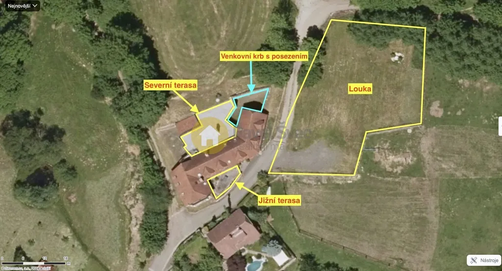 K domu náleží a je v těsné blízkosti pozemek/louka s výměrou 1.425 m2 (možnost parkování, na pozemku je studna).