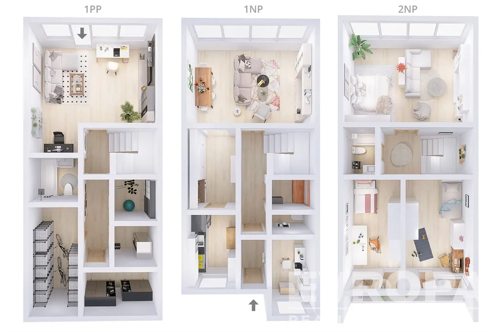 V přízemí domu se nachází skladové a technické místnosti, toaleta a obývací pokoj se vstupem na zahradu. V prvním podlaží domu se nachází šatní místnost, toaleta komora, kuchyň a obývací pokoj. Ve druhém podlaží domu se nachází 2 ložnice se vstupem na balkon, hlavní ložnice s výhledem do zahrady a toaleta.