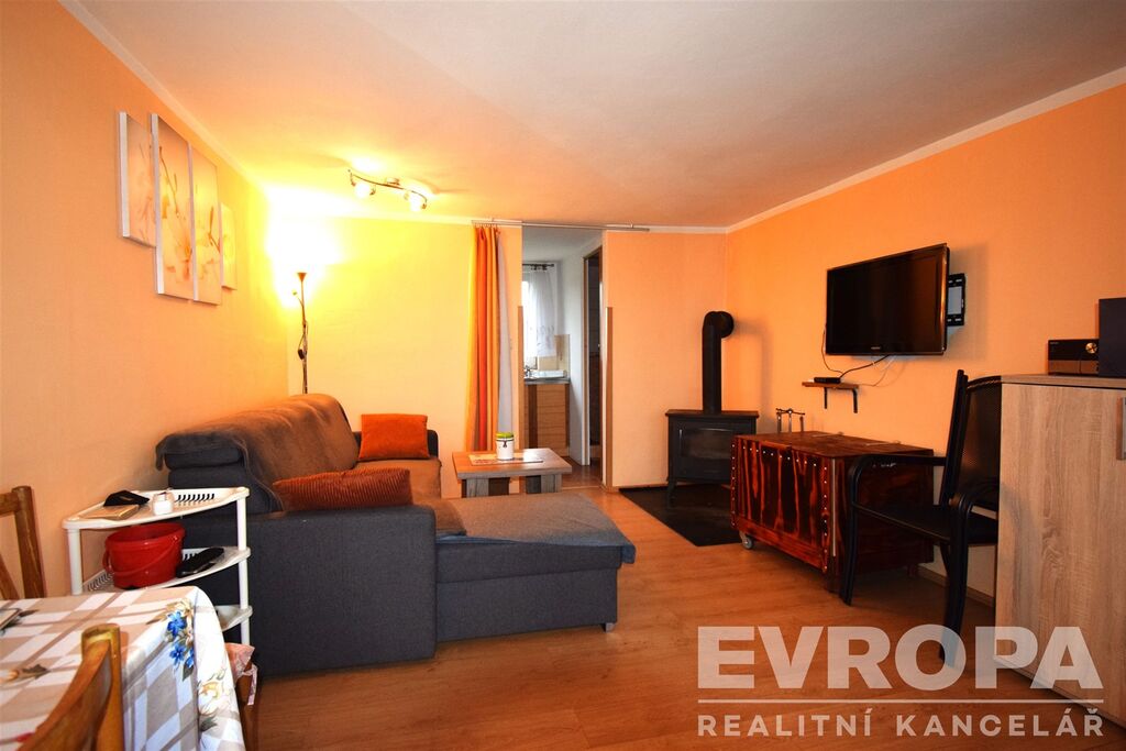 Na pozemku je i pěkný, velmi praktický a prostorný volně stojící zděný zahradní domek o užitné ploše 35 m2. Na zahradní domek navazuje zastřešená terasa s krásným výhledem nejen na celou velkou zahradu, ale i do okolní krajiny. Zahradní domek disponuje velkou obývací místností vytápěnou krbovými kamny na dřevo, dále pěknou kuchyňkou, sprchovým koutem a WC. Pod kuchyňkou je sklep, ve kterém je umístěn elektrický bojler. Sklep s ohledem na jeho velikost je možné využít i jako sklep na ovoce a zeleninu.