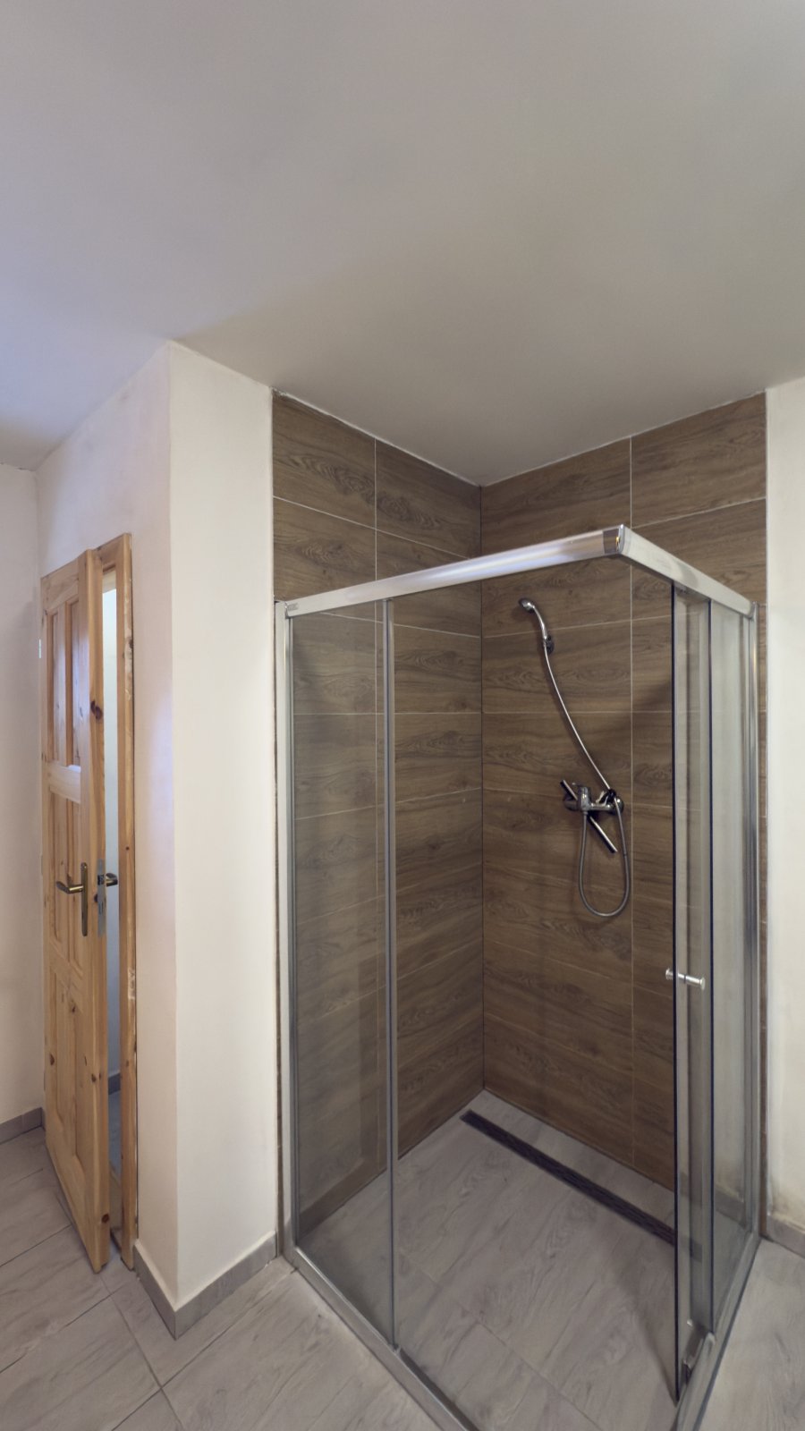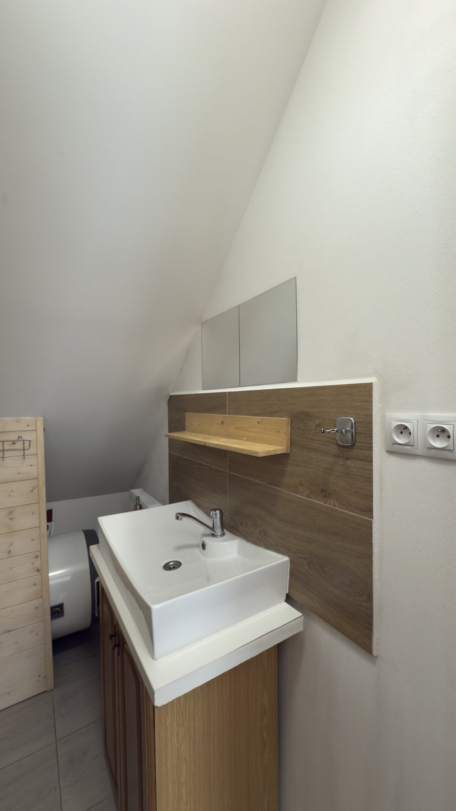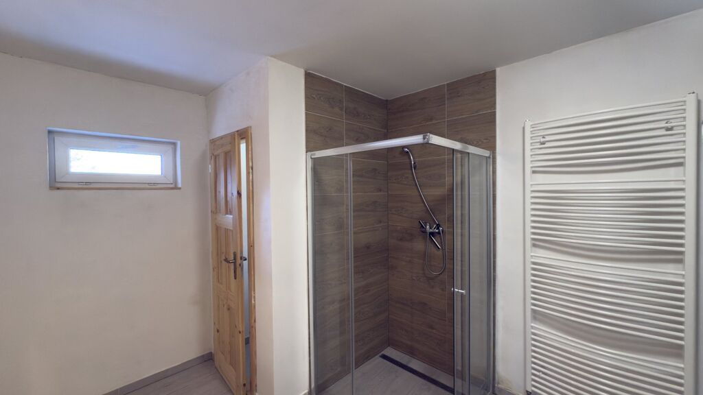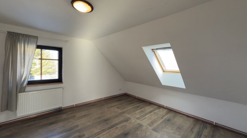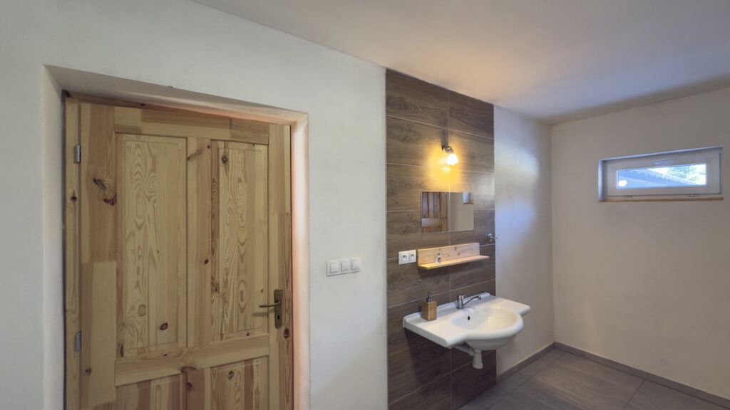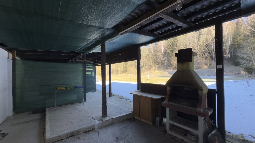 Přízemí zahrnuje kuchyni spojenou s jídelnou a obývacím pokojem se vstupem na terasu, prostornou koupelnu se sprchovým koutem a toaletou, skladovací prostor a technickou místnost. V 1. patře najdete dva samostatné pokoje, koupelnu se sprchovým koutem a WC, úložný prostor. Vytápění zajišťují krbová kachlová kamna s výměníkem, voda je ze studny a odpad je řešen septikem. Zastavěná plocha včetně terasy je 206 m².