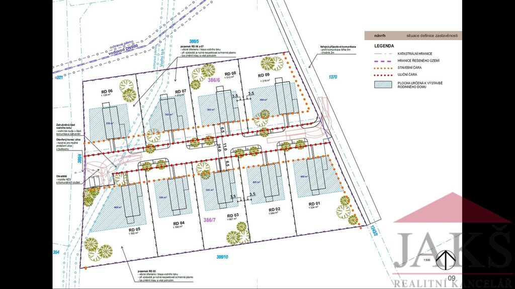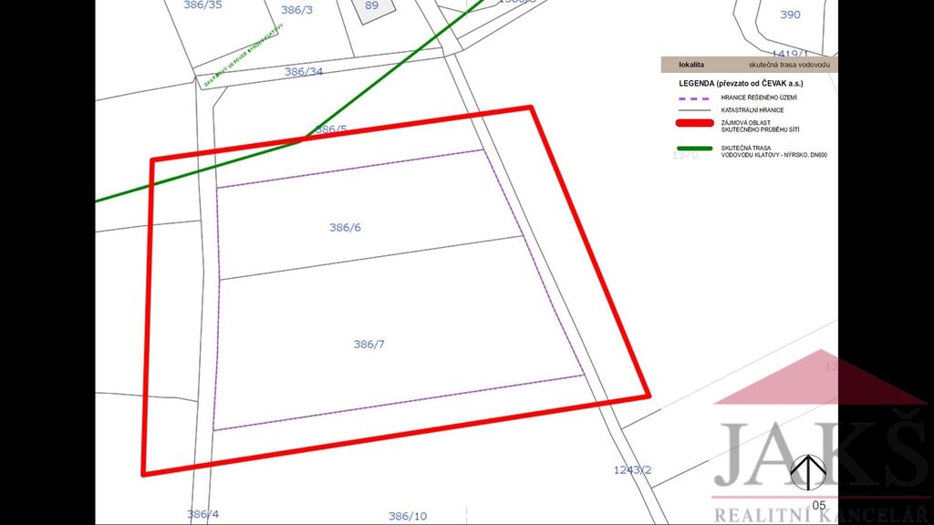 Voda: neřešeno; v obci není obecní řad, avšak za severní hranici prodávaného pozemku v pozemku p.č. 386/5 prochází vodovod DN600 Nýrsko – Klatovy – viz studie.