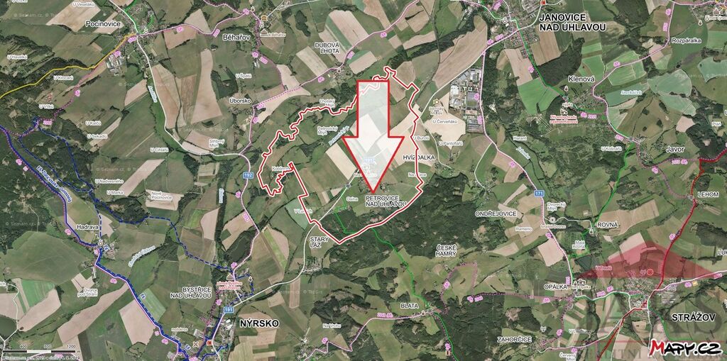 Nabízíme na prodej slunný, mírně svažitý pozemek o celkové výměře 11.860 m2 se zpracovanou územní studií na výstavbu 9 rodinných domů. Pozemek se nachází na okraji zástavby v klidné jižní části „Pod lesem“ v obci Petrovice na Úhlavou, ležící mezi městy Janovice nad Úhlavou 3 km a Nýrsko 4 km. Dle platného územního plánu města Janovice nad Úhlavou je pozemek určený k výstavbě rodinných domů venkovského typu (BV).