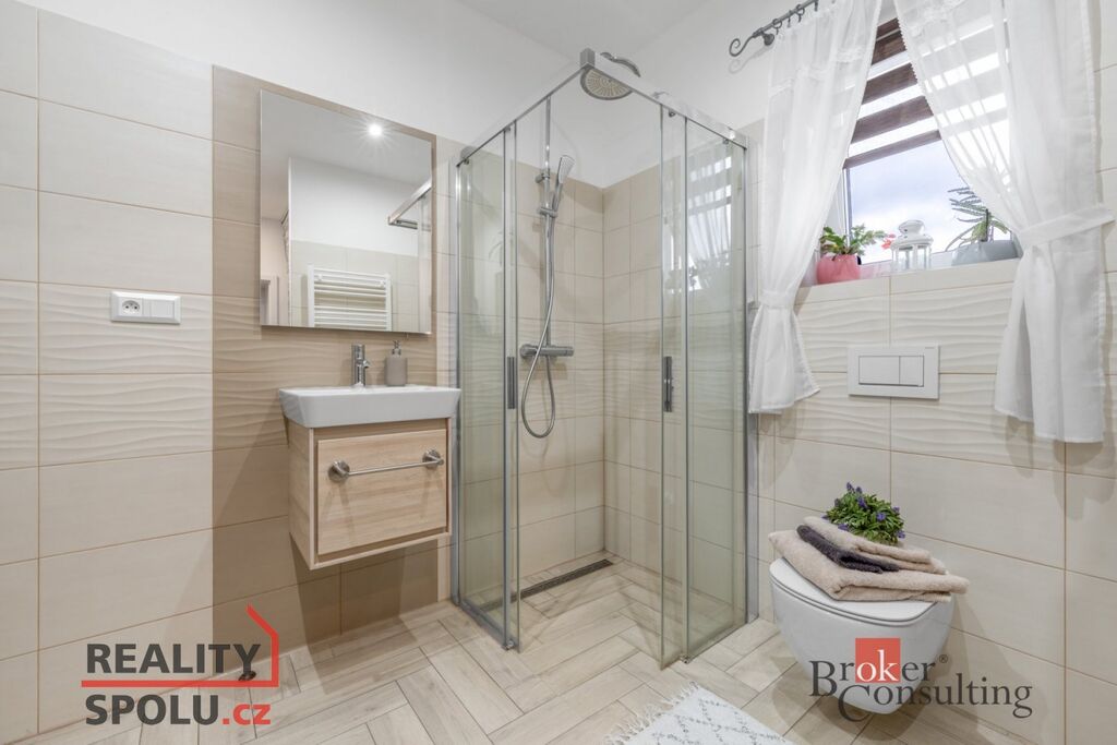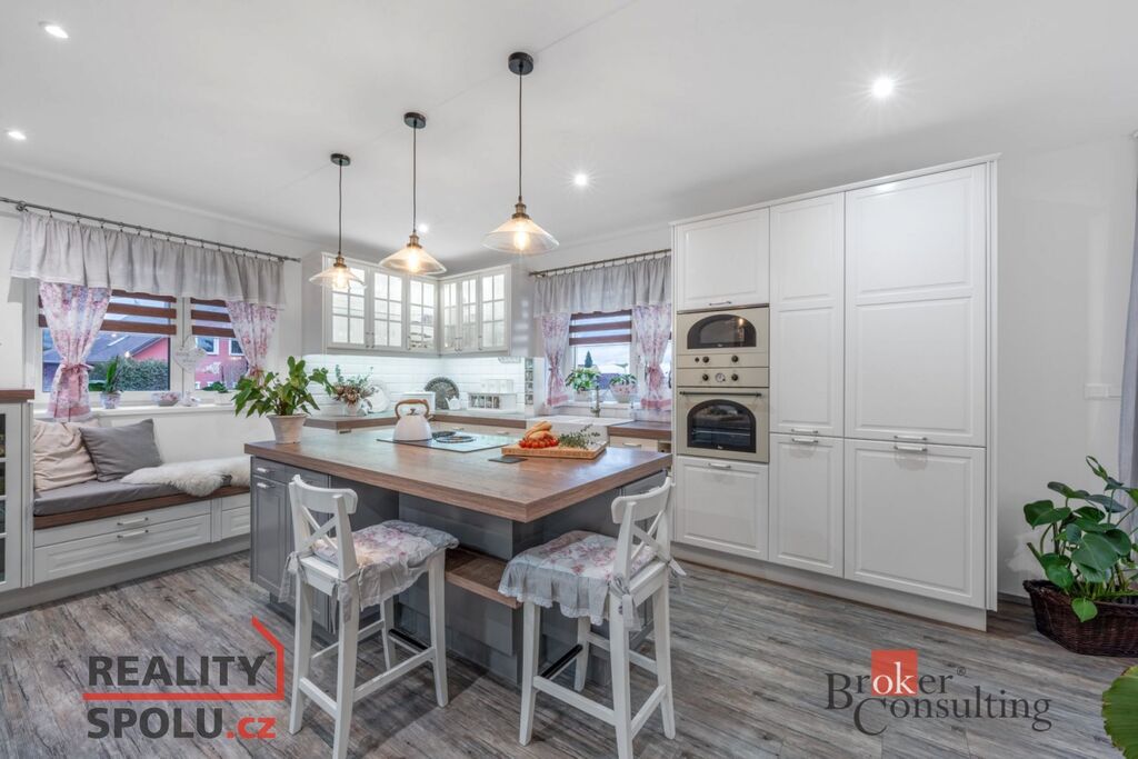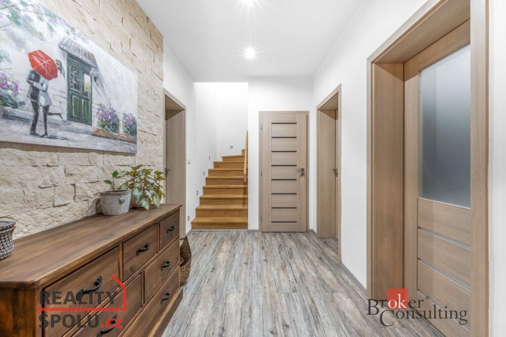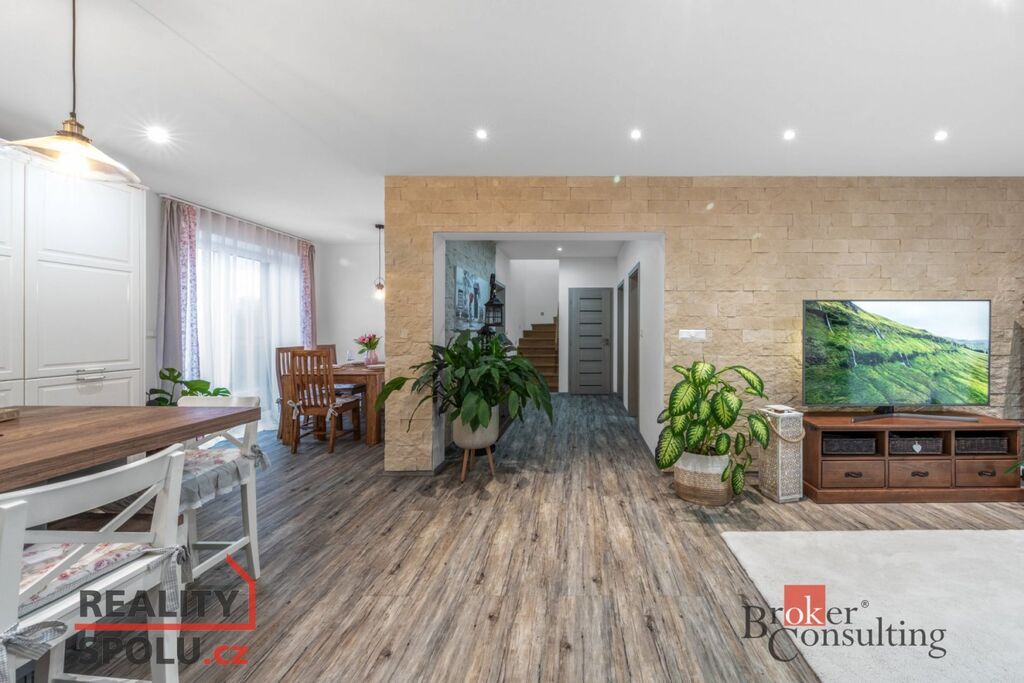 V přízemí domu naleznete vstupní chodbu s úložnými prostory, ložnici, prostorný a světlý obývací pokoj s výstupem na dvě venkovní terasy. Dále zde najdete moderní kuchyňský kout s ostrůvkem a jídelnu. Kuchyňská linka je vybavena značkovou mikrovlnou a vestavnou troubou, varnou deskou se zabudovanou digestoří, myčkou a lednicí. Součástí přízemí je ještě úložný prostor pod schody a koupelna se sprchovým koutem a WC.