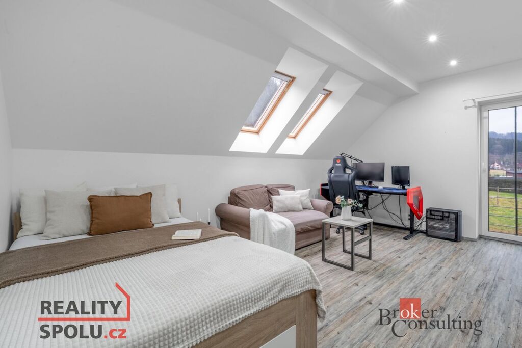 Do patra se dostanete dřevěným schodištěm. V patře domu se nacházejí ložnice, obývací pokoj, kuchyňská linka s vestavnou troubou a varnou deskou. Dál pokoj pro hosty či herní místnost a koupelna s vanou, sprchovým koutem a WC.