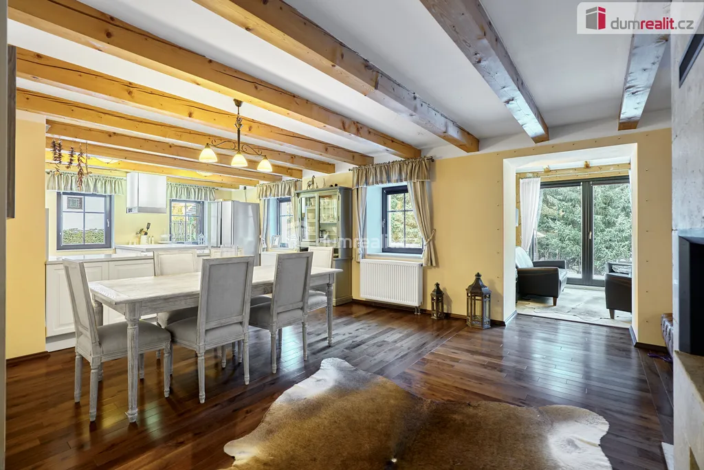 RD je zděný, částečně podsklepený, s podlahovou plochou 230 m². Dispozice domu zahrnuje prostorný obývací pokoj s krbovými kamny, kuchyň s kuchyňskou linkou na míru, jídelnu, 3 ložnice s vlastními koupelnami a WC. V přízemí je finská sauna vč. sprchy a odpočívárny, zimní zahrada s terasou a vstupem na zahradu. Dále je zde prostorná chodba vč. schodiště, zádveří, samostatné WC a technická místnost. Dům má velký půdní prostor (možnost vybudování další obytné místnosti). Vytápění domu a ohřev vody je zajištěn plynovým kotlem. Dům disponuje elektronickým zabezpečovacím systémem, finskou saunou, venkovní vířivkou a dalšími luxusními prvky. Po kompletní rekonstrukci, kdy byl kladen důraz na kvalitu použitých materiálů, provedení ale i vybavení domu, je dům připraven k okamžitému nastěhování bez dalších investic.