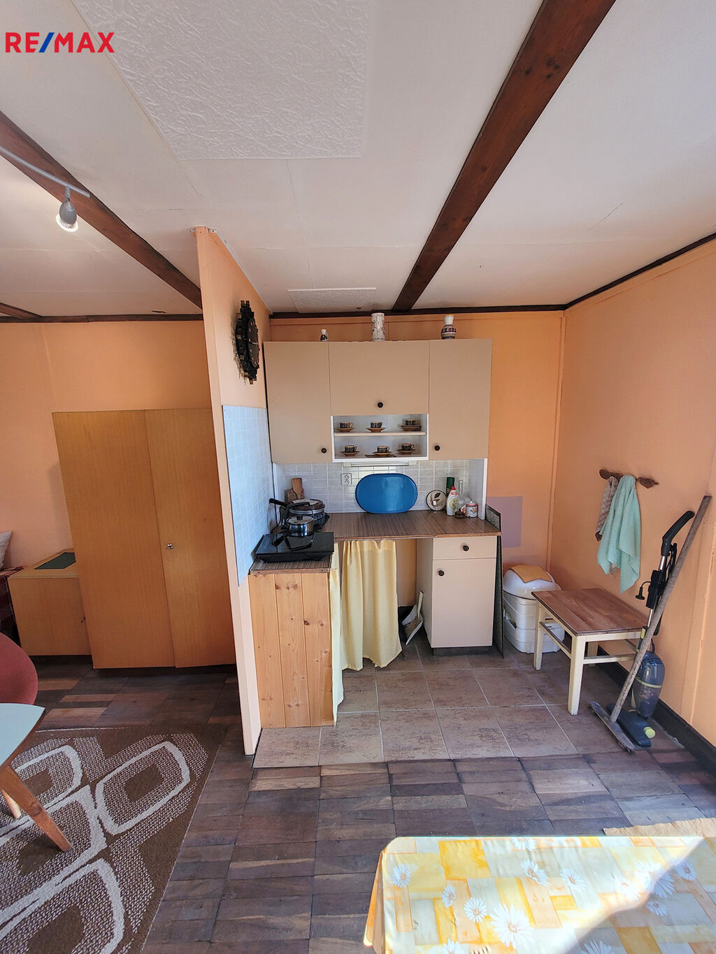 V patře se nachází jídelní kout a možnost přespání, samostatné WC je v přízemí.