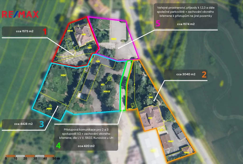 Nabízíme Vám tedy koupi nemovitosti jako celek, tzn. všechny budovy a pozemky o celkové evidované výměře 11 035 m². Anebo přicházíme s pracovním návrhem na dělení a vytvoření třech funkčních celků pracovně označených 1, 2, 3 se zajištěním přístupových cest a parkování na plochách pracovně označených 4 a 5. Budoucí využití stávajících budov a pozemků záleží již na budoucích nových vlastnicích buďto s možností koupě celku a nebo, dle jednotlivě navržených ploch 1, 2, 3 se spolupodílem na plochách 4 a 5.