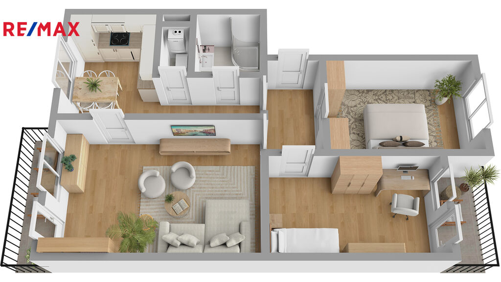 V obývacím pokoji je zabudována klimatizace. Ze dvou pokojů je vstup na zasklené lodžie, které poskytují ideální prostor pro relaxaci a odpočinek.