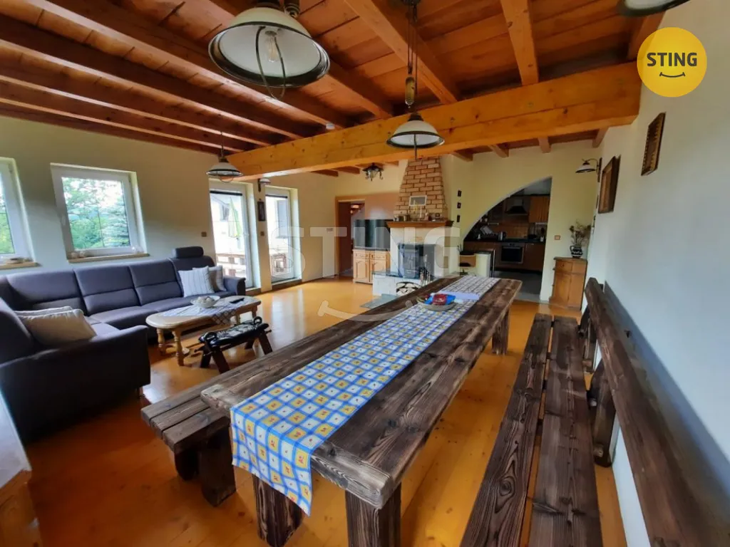 Interiér domu je velmi vkusně vybaven. V přízemí se nachází prostorný obývací pokoj s krbem, plně vybavená kuchyně, pokoj, koupelna, šatna, WC, herna a hala se schodištěm. V podkroví jsou čtyři pokoje a dvě koupelny, což zajišťuje soukromí a pohodlí. Je možné ponechat stávající zařízení, což je velkou výhodou. Prodávající má zavedený rezervační systém pro ubytovací zařízení, což usnadňuje případný pronájem a je možnost převodu na nového majitele