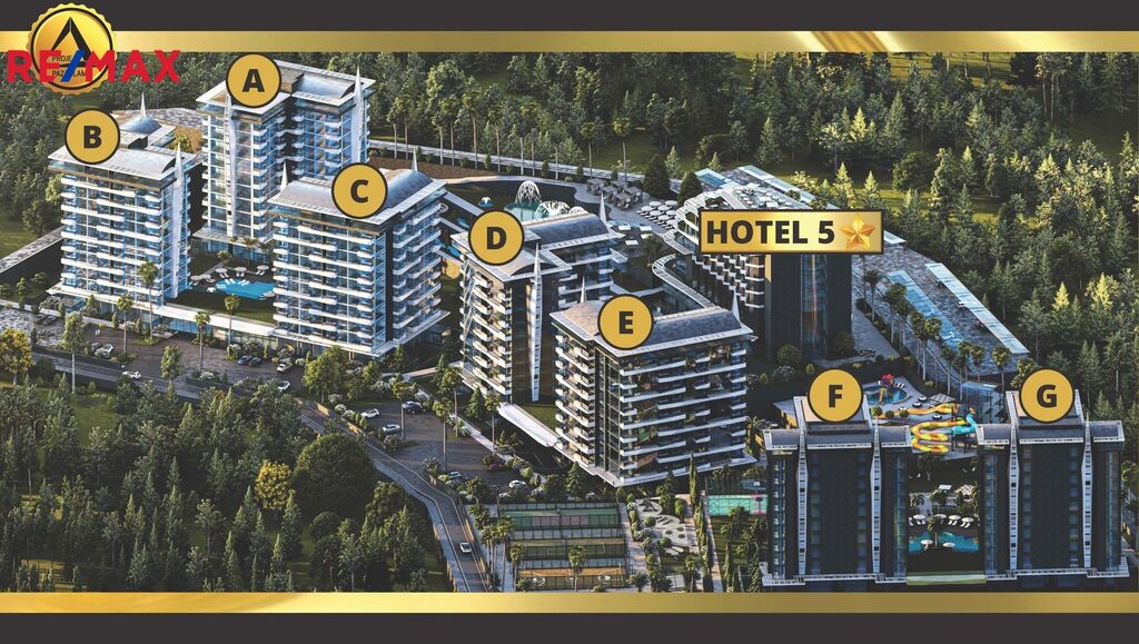 Představují byt v unikátním luxusním komplexu, který se nachází v chráněné oblasti, uprostřed jehličnatého lesa, nedaleko růžové písečné pláže. V okrese  Avsalar  na severu Alanye a je považován za jednu z nejkrásnějších oblastí. Projektová oblast zajímá - 52.000 m2 se vzdáleností k moří - 900 m. Začátek stavby -  30.06.2023  a konec  30.06.2025 roku. Na území se nachází luxusní 5tihvězdičkový hotel s bohatou infrastrukturou, kde je zajištěno vše pro pohodlný pobyt: bazény, vodní plochy, fitness, lázně, park, sportovní a zábavní prostory, lobby, recepce, ostraha a mnoho dalšího. Majitelé v obytném komplexu mohou používat celou hotelovou infrastrukturu.