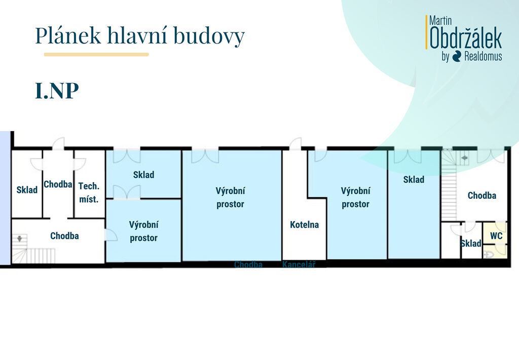 Areál se skládá z hlavní budovy a přilehlých výrobních a skladovacích prostor. V hlavní budově jsou v přízemí celkem čtyři velké prostory nabízející širokou škálu možností využití, od skladovacích, po výrobní prostory, případně kanceláře. Jeden z nich je rozdělen příčkou. Dále dvě menší technické místnosti, serverovna a toalety. Přístup do patra je z chodeb na obou stranách budovy. V patře je celkem deset samostatných kanceláří, společná kuchyňka na chodbě a čtyři toalety.