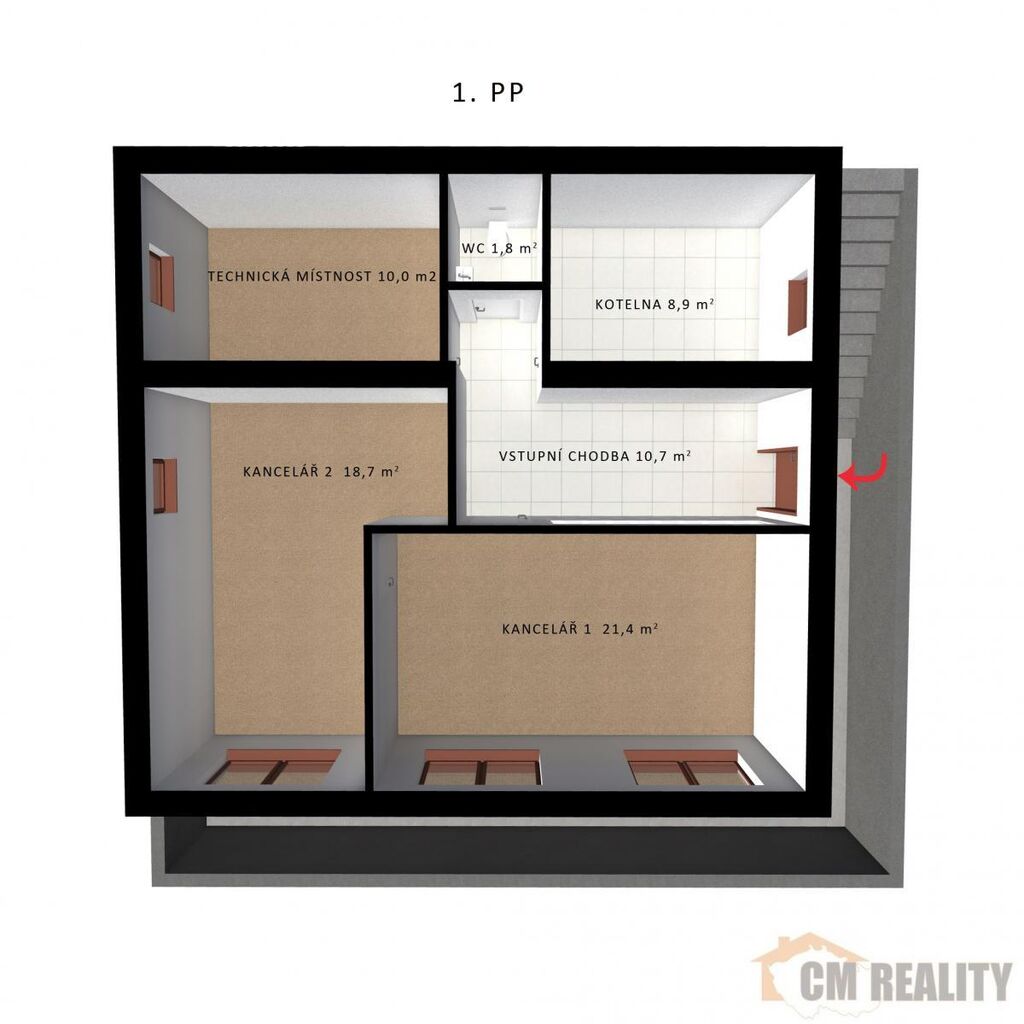 Suterén domu sloužil majiteli jako kanceláře s vlastním soc. zařízením a kuchyňkou. Vstup do kanceláří je samostatný z boční strany domu. Suterén lze případně využít i jako samostatný byt.