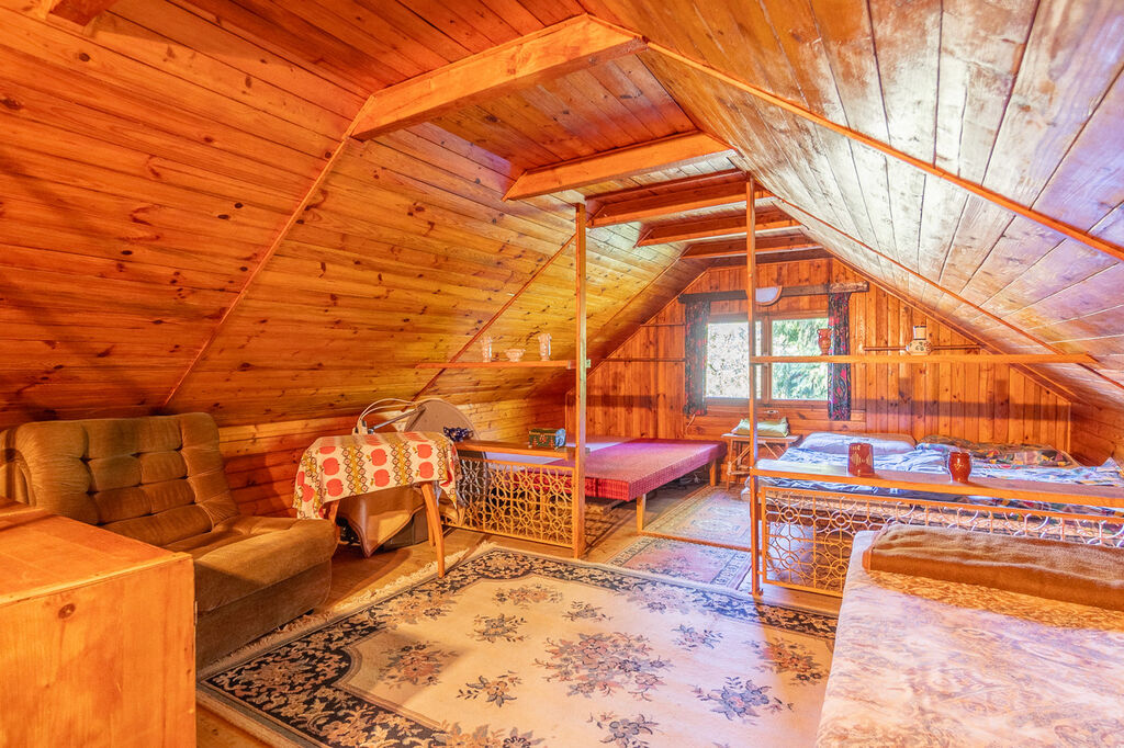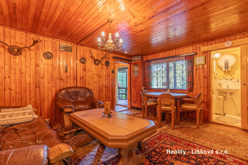 Dispozičně je řešena jedním velkým obývacím pokojem, kuchyňkou, koupelnou se sprchovým koutem, umývadlem, WC toaletou a v podkroví vestavěnou prostornou ložnicí s pěti lůžky.