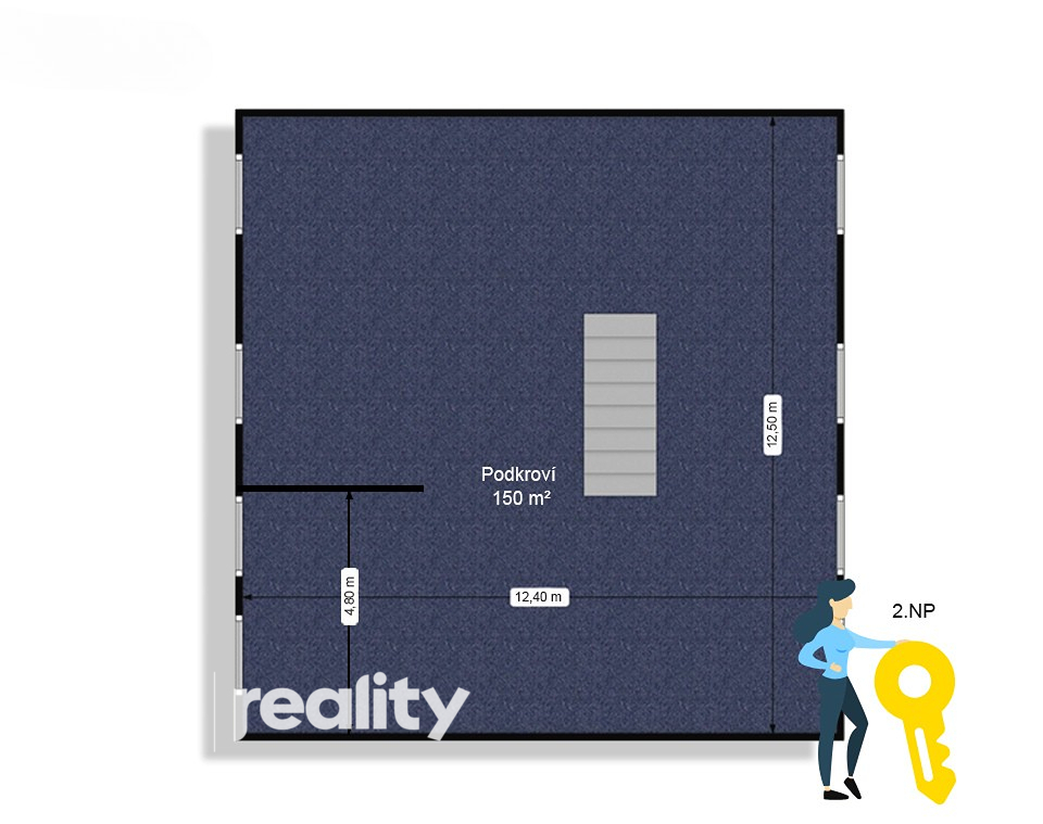 Objekt má tři podlaží, z nichž každé nabízí přibližně 150 m² užitné plochy, tedy celkem cca 450 m² vnitřních prostor.